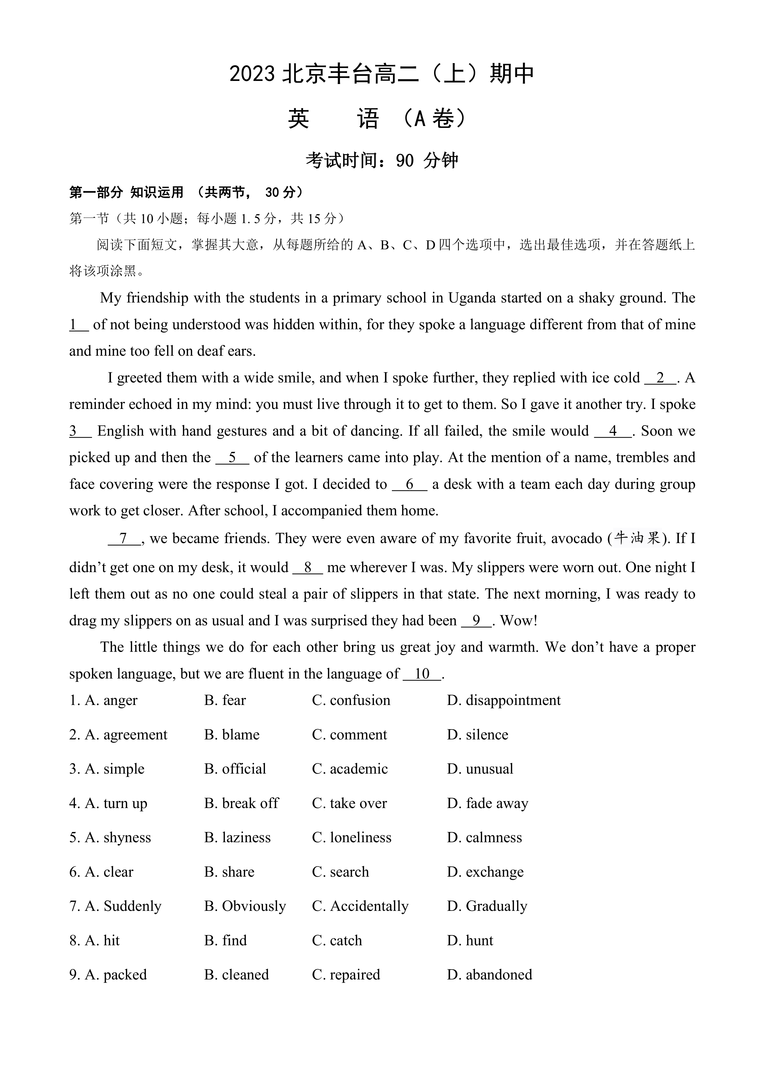 2023北京丰台高二(上)期中英语(A卷)(含解析