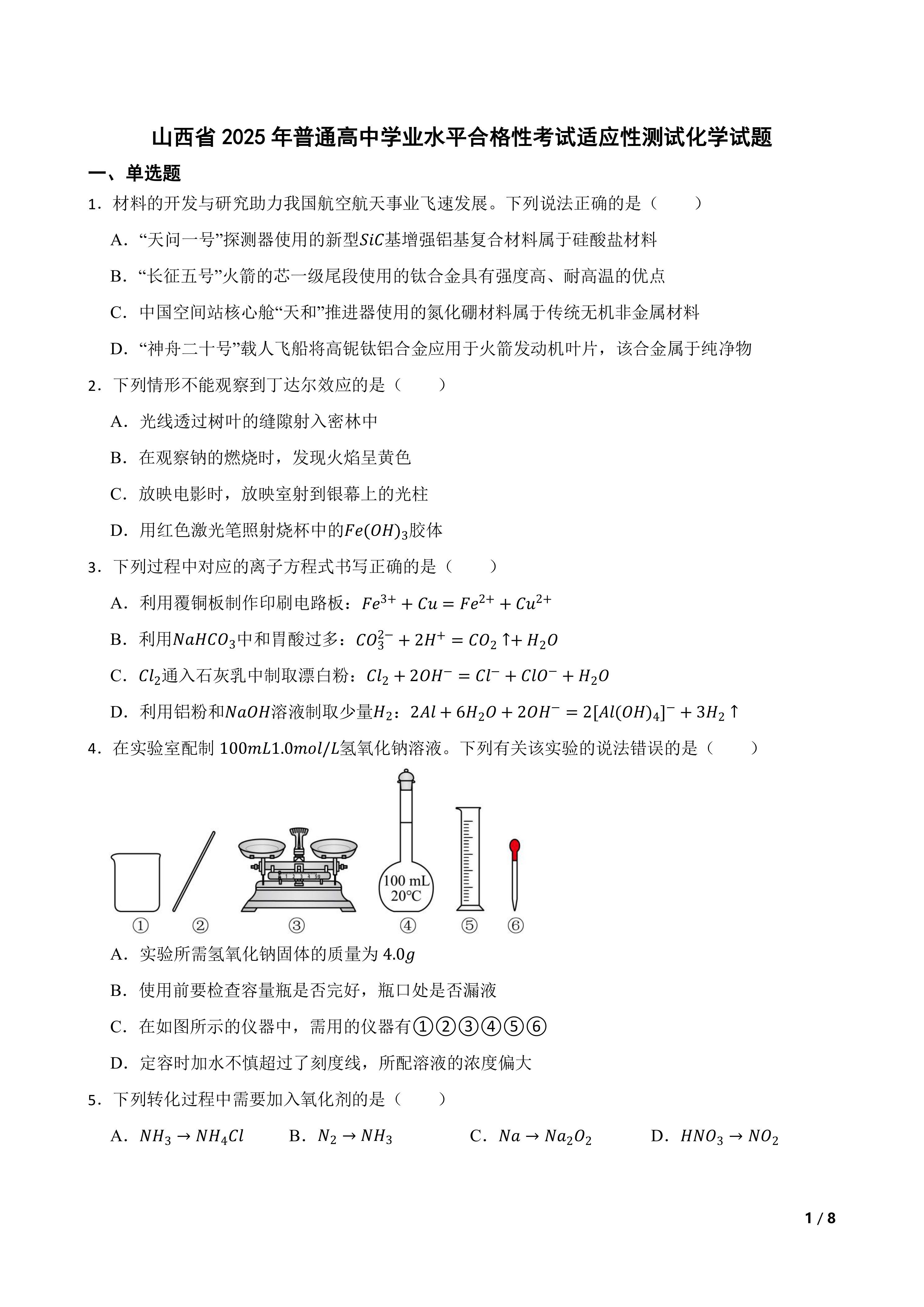 【高考真题】山西省2025年普通高中学业水平合格性考试适应性测试化学试题