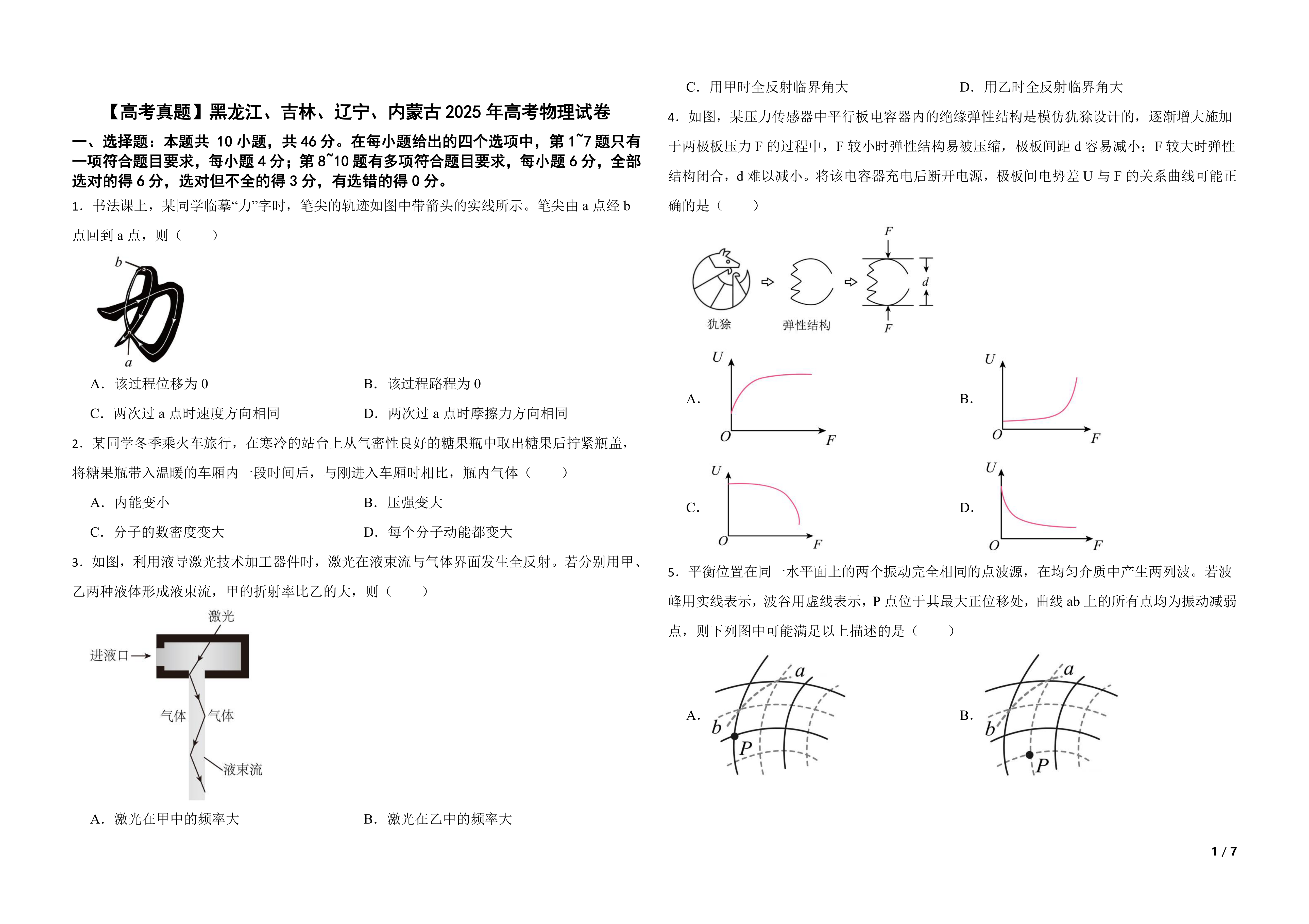 【高考真题】黑龙江、吉林、辽宁、内蒙古2025年高考物理试卷