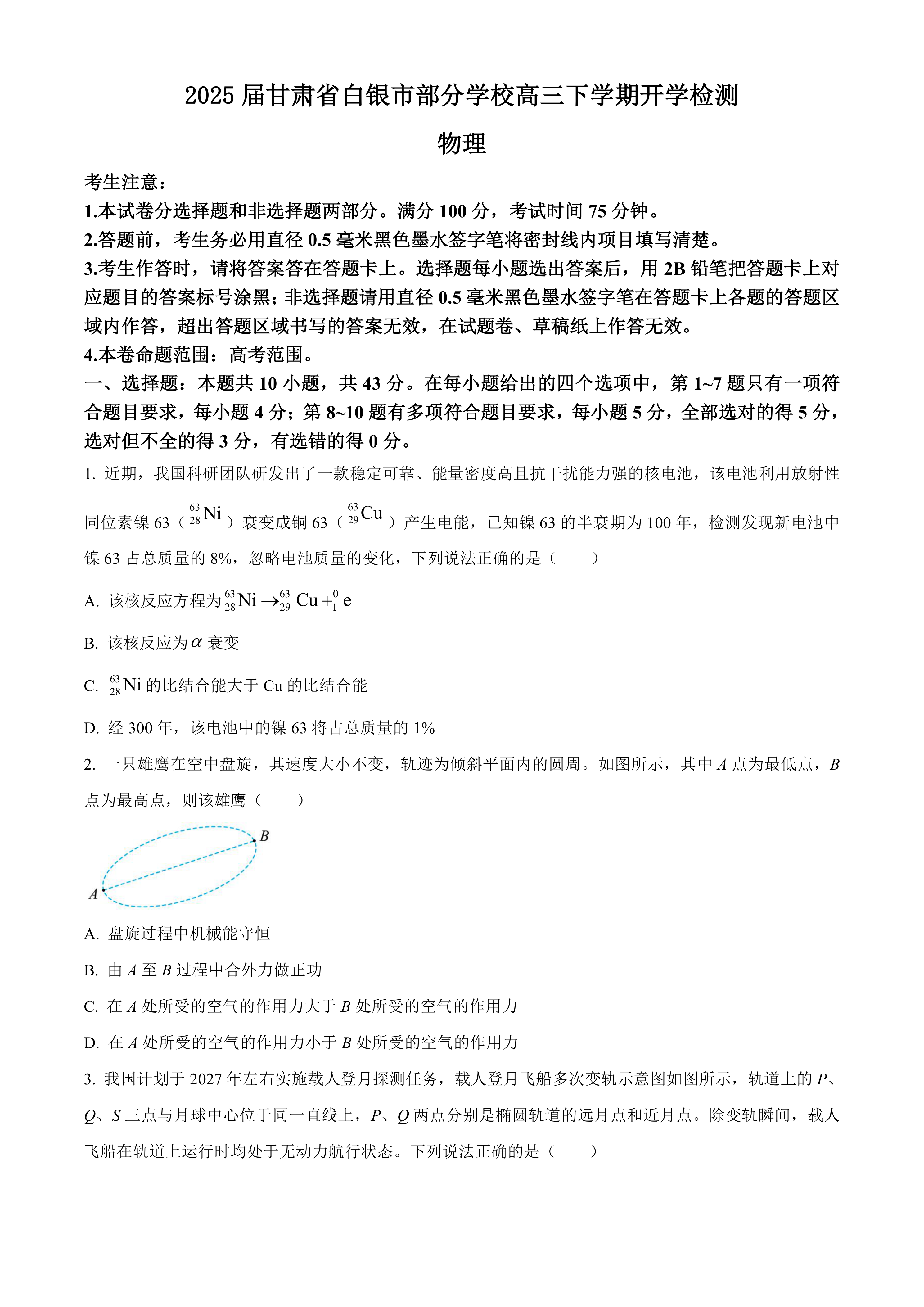 2025届甘肃省白银市部分学校高三下学期开学