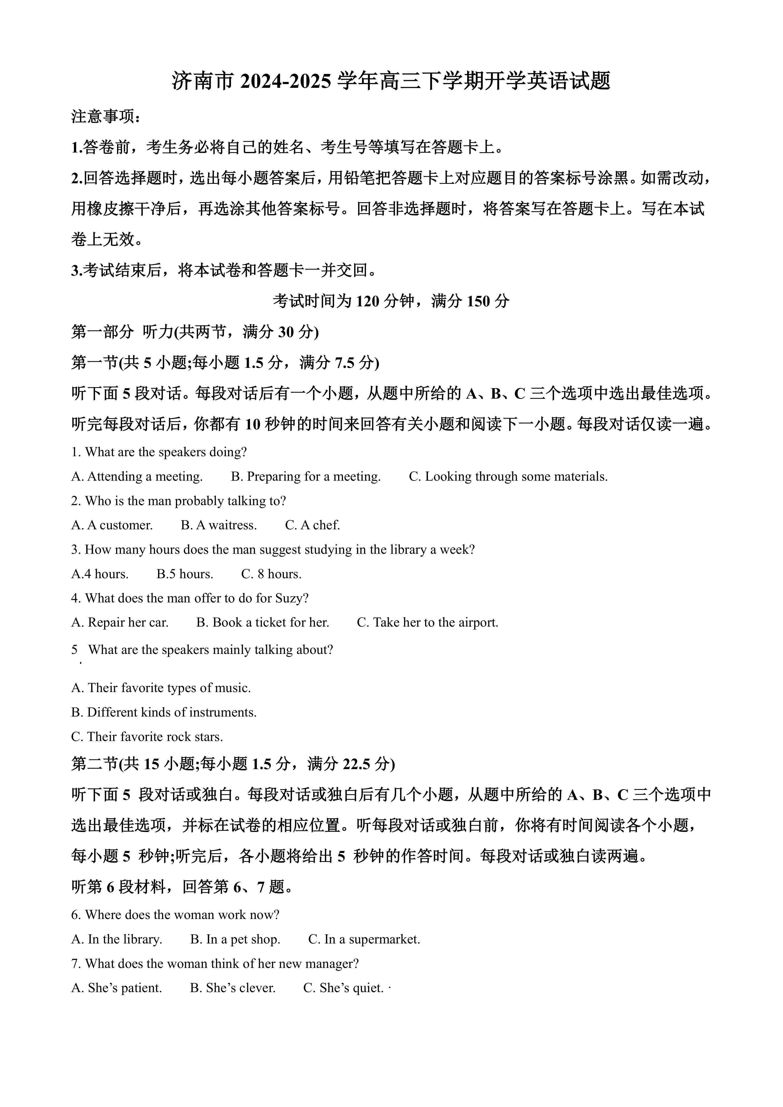 山东省济南市2024-2025学年高三下学期开学