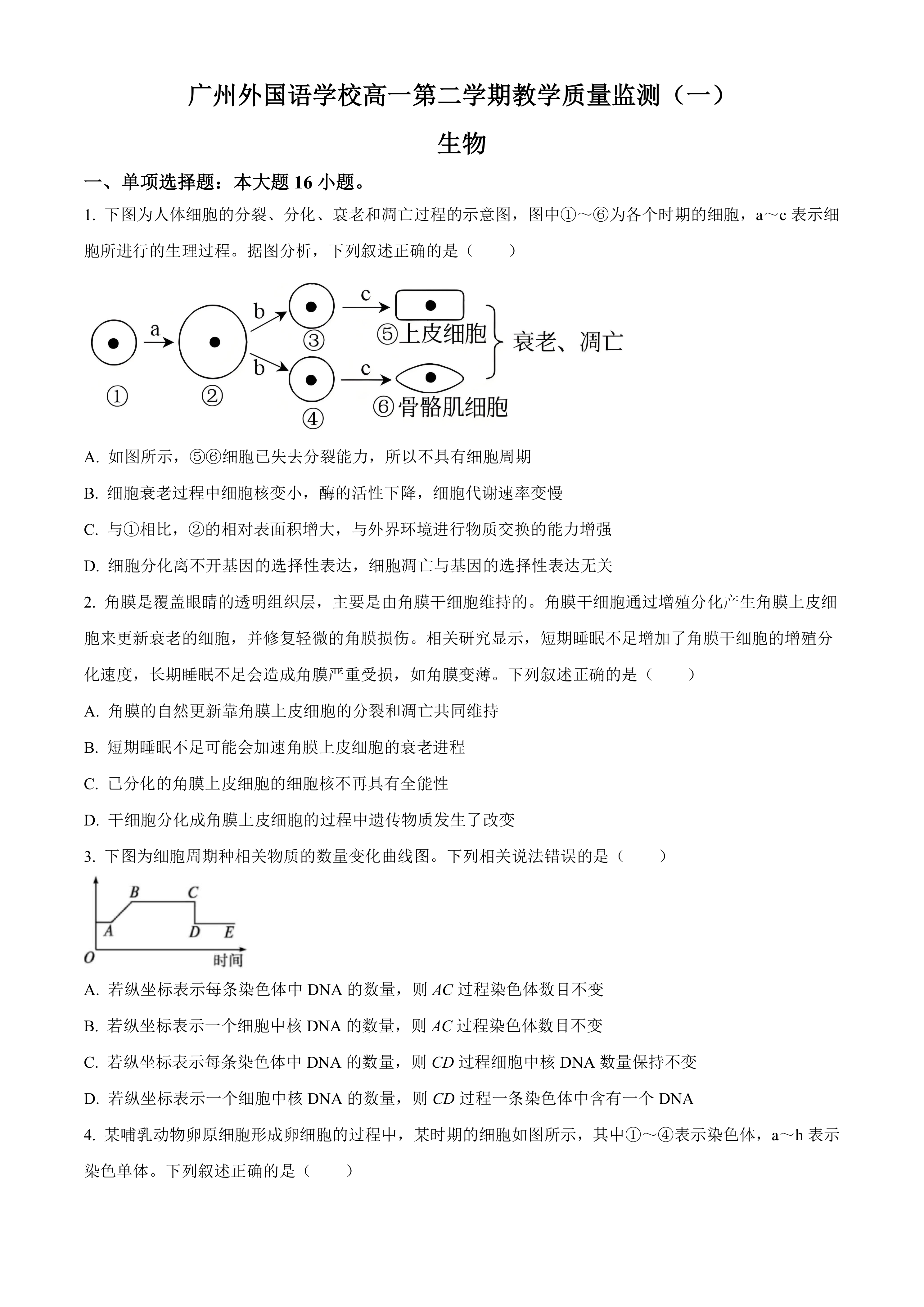 广东省广州市南沙区广州外国语学校2024-2025学年高一下学期3月月考生物试题(含答案)